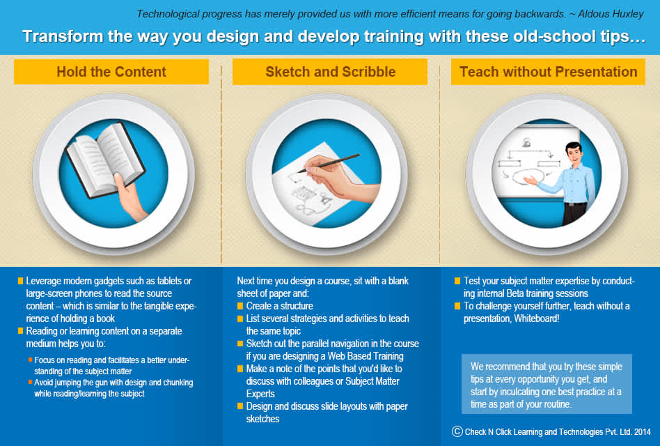 It’s understandable that you may not be able to apply most of these tips in every project. However, we recommend that you try these simple tips at every opportunity you get, and start by inculcating one best practice at a time as part of your routine. These are simple, but effective tips to add some vintage innovation to your course development process.